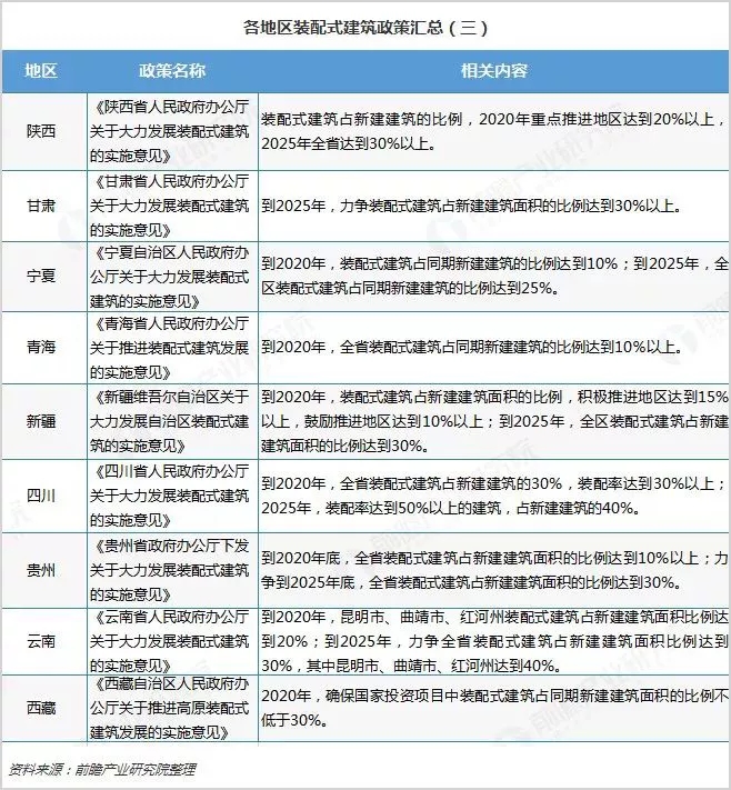 目前我國(guó)31個(gè)省市、自治區(qū)都已經(jīng)制定了裝配式建筑發(fā)展規(guī)劃,其中北京、天津、浙江等地提出,到2020年實(shí)現(xiàn)裝配式建筑占新建建筑面積的比例達(dá)到30%以上,高于全國(guó)目標(biāo);而海南省提出在2020年裝配式建筑占比達(dá)到50%。